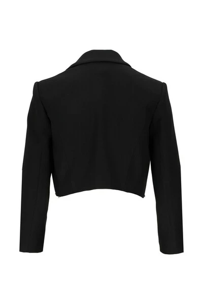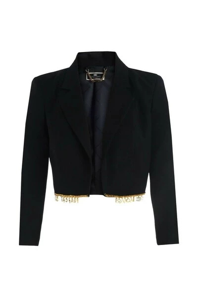 Bijgesneden jas van Elisabetta -franchi gemaakt van koele zwarte wol, verfraaid met gouden kettingdetails en charmes op de bodem. Landde interieur, gevoerde schouders en reverskraag. 3/4 mouwen.