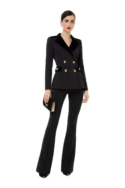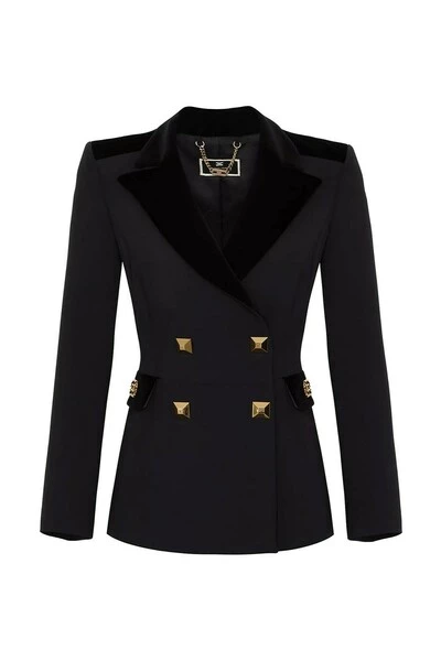 Elisabetta franchi jas gemaakt van dubbele zwarte stretch crêpe met fluwelen details. Gevoerde schouders, beklede interieur en sluiting met dubbele rijs met logo-golden metalen studs. Logo -details op de zakken, slanke pasvorm.