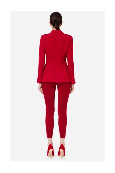Elisabetta franchi rood fluwelen jas Dubbele beefde jas met 2 boterknoppen, met patches op de schouders met logo -platen van de collectie en piramidale studs. Snijdt in het centrum van de mouw met satijnen leidingen die eindigen in een klein gekraak. Snijdt in de zijkanten die de figuur definiëren met satijnen leidingen. Lange mouwen.