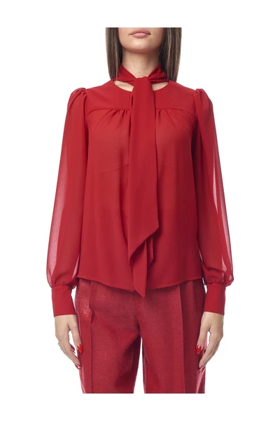 Elisabetta franchi shirts rood fluwelen shirt met lange plakjes met een jacht in de schuiflijn van Elisabetta -franchi. Het heeft een sjaalhals om op de voor- of achterkant te knopen en een gedrapeerd vouwmotief dat het shirt beweegt. De blouse opent op de achterkant door kleine knoppen gescheiden door een centraal kanon. Samenstelling: 100%polyester kleur: rood wassen: droog wassen