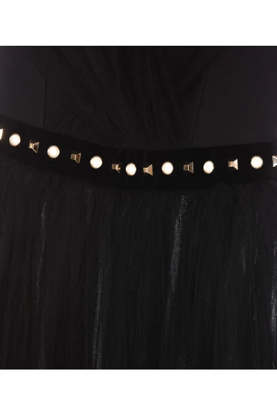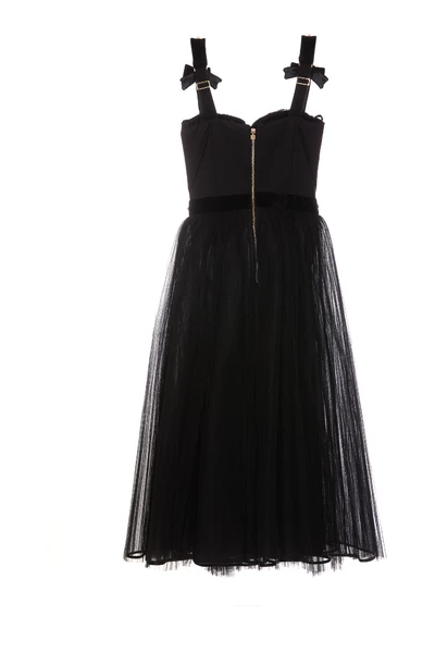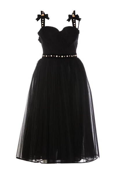 Elisabetta franchi zwarte vrouw jurk, rugzipkeur, mouwloos, boogdetail op schouder, studs en parels details, harthals, midi rok in tule, frontale fluwelen riem