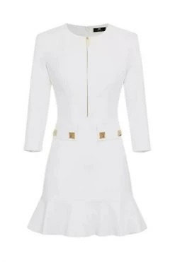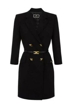 Coat-jurk van Elisabetta-franchi gemaakt van zwart fluweel met nep met dubbele borsten met knopen met gemodificeerde gouden metalen studs. Crepe -profielen en faux weldzakken aan de voorkant. V-hals, gevoerde schouders en 3/4 mouwen. Zip sluiting aan de achterkant, strakke pasvorm.