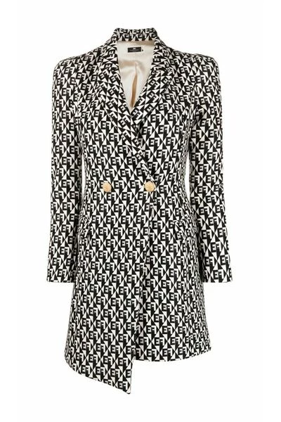 Elisabetta franchi-jurken logo diamanten print blazerjurk van Elisabetta-franchi met zwart/wit, gekke revers, kussen met dubbele rij knopen, twee zijkapzakken, diamantafdruk, monogrampatroon en asymmetrisch ontwerp.
