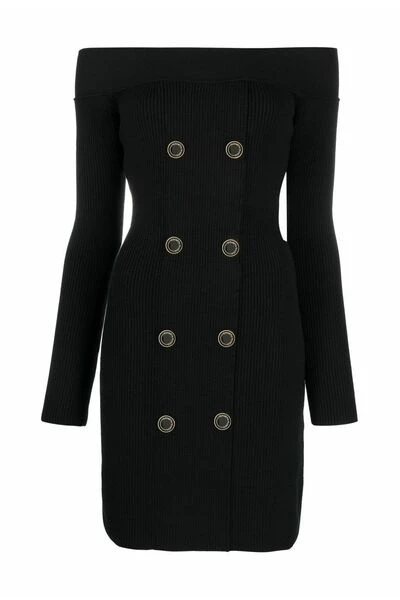 Elisabetta-franchi-jurken zwarte off-shoulder gebreide blazerjurk van Elisabetta-franchi met zwarte, geribbelde gebreide, decoratieve knopdetails, off-shoulder en lange mouwen.