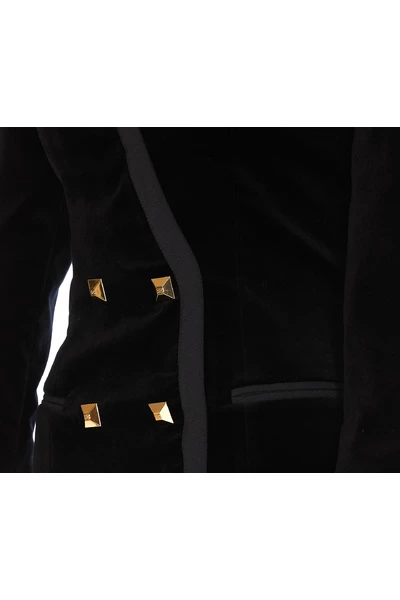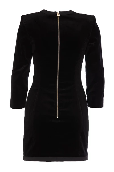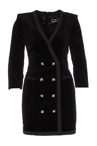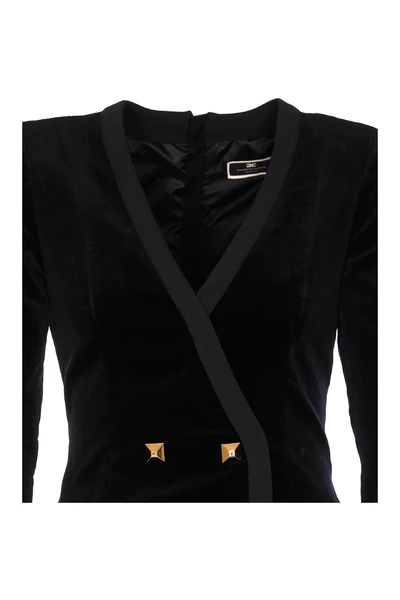 Elisabetta franchi jurken zwarte vrouw mini-jurk, v-hals, frontale gouden knopen met logo, frontale zak, dubbele borsten, versterkte schouder