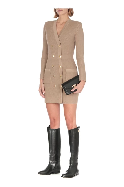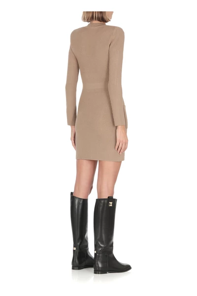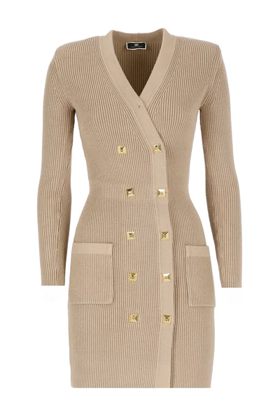 Elisabetta -franchi -jurken Dove Gray – Bruine Elisabetta Franchi Ribbed Dress voor vrouw – gebreide nek – lange mouwen – voorste vierkante knopen bevestigen – Twee voorste spleetzakken