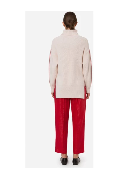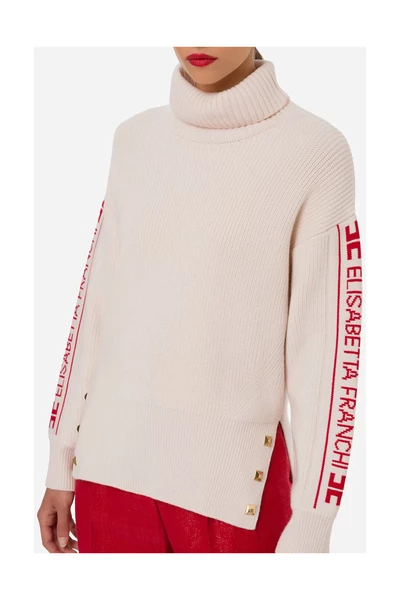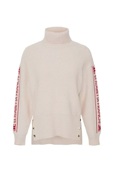 Elisabetta Franchi Burro/Red Velvet Sweater over Lena -truien, met een ingeblikt volume, met een langere achtergrond dan de zoete levensduur van de voor- en nek. Op de mouwen geven twee contrasterende Jacquard Logods het kledingstuk een stedelijke verschijning. De kop van de maxi -logo -studdes geplaatst op de bodem van de voorste jersey verfraaid.
