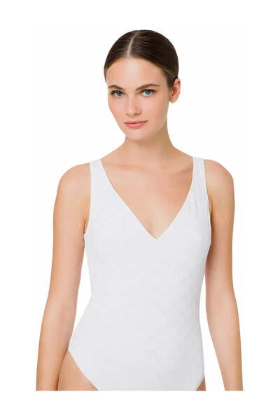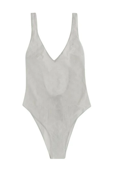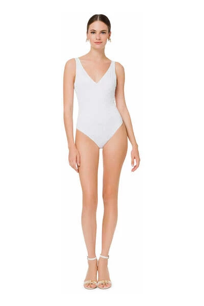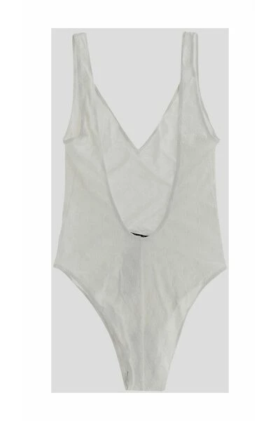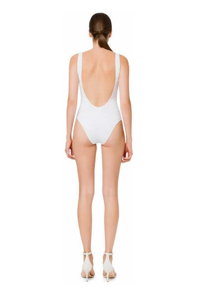 Ivory White Logo Jacquard uit één stuk zwempak van Elisabetta Franchi met stretch-ontwerpping, Jacquard Logo Motif, V-hals en mouwloos. Let op om zwemkleding over je eigen kleding te proberen ..