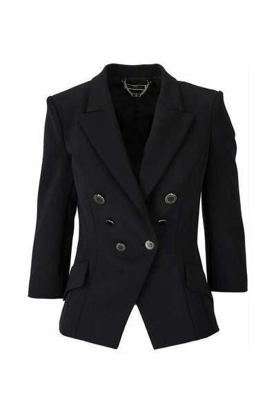 Elisabetta franchi jas GI03026E2 dubbele jas in stretchscheuren, 3/4 mouwen en brede rever halslijn. Gouden logo -knoppen. Hechtende pasvorm. Samenstelling: 95% PL, 5% EL