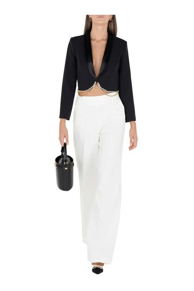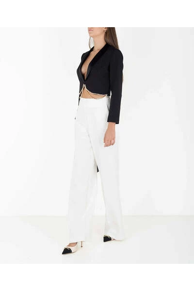 Korte jas Elisabetta -franchi in scheuren. V -neck met satijnen galm en drie -quarter mouw. Strass details ingesteld naar de onderkant. Sluiten met haken. Het model draagt maat 40.