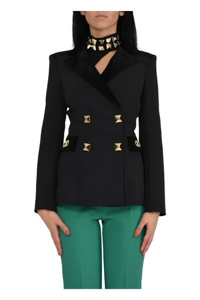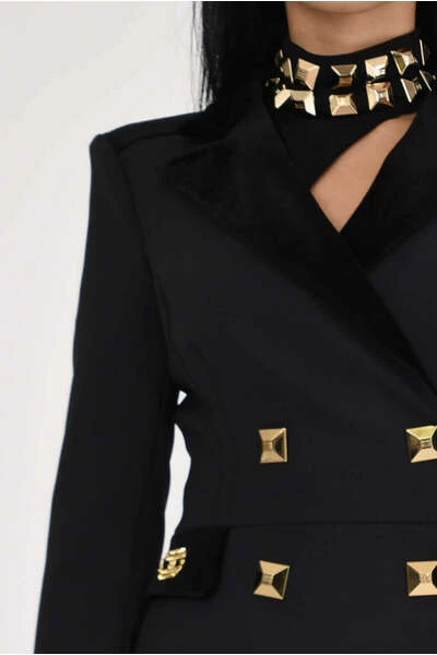 – Dubbele rijstige lijn- in dubbele scheur- Maxi gemonteerde gouden kook- Logo-accessoire op rechte patrooncompositie: 96% polyester 4% elastaan- gemaakt in Italië