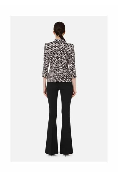 Elisabetta franchi jas in stretch scheuren, pijpleidingontwerpboter en zwart. Dubbele -schepende sluiting met goud -gekleurde logo -knoppen. Hechtende lijn. Patta -zakken aan de zijkant, 3/4 mouwen en brede galm halslijn.