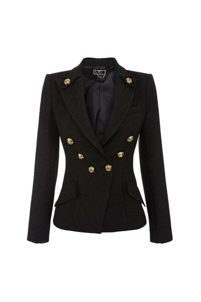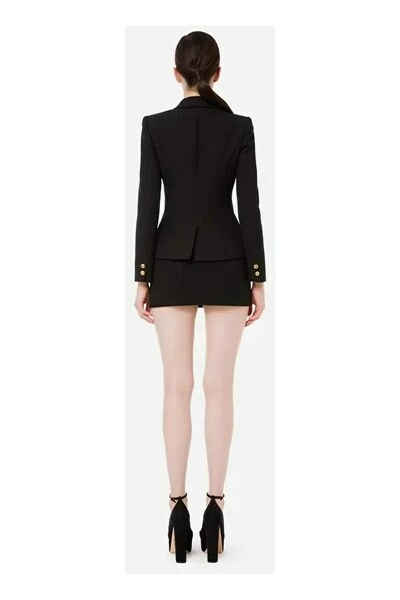 Kruis -gekleurde kruisjack van het merk in een stof met een framework -effect. De halslijn is een flap met een bepaald patroon dat overlapt en sluit met een knop. De knoppen zijn bolvormig met een badge met het verouderde metalen logo. Tab -zakken. GI03327E2 Technische beschrijving: Cruciate jas nek met flappen