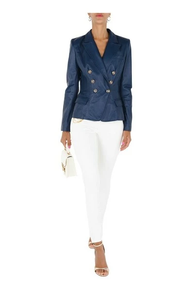Elisabetta franchi lederen jas. V -Neck met Rever en Slee op drie vierde. Budgetzakken, Slit Slide. Dubbele beperkende sluiting met logo -wijzigende knoppen. Het model draagt maat 40.