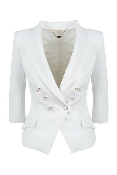 Elisabetta franchi stretch crêpe dubbele breasted jas, met geëmailleerde logo-knoppen. – FW22 – Slim Fit – Peak Revel – Gevoerde schouder – 3/4 mouwen – Flapzakken aan de zijkant – Made in Italië – 96%Polyester 4%elastaan