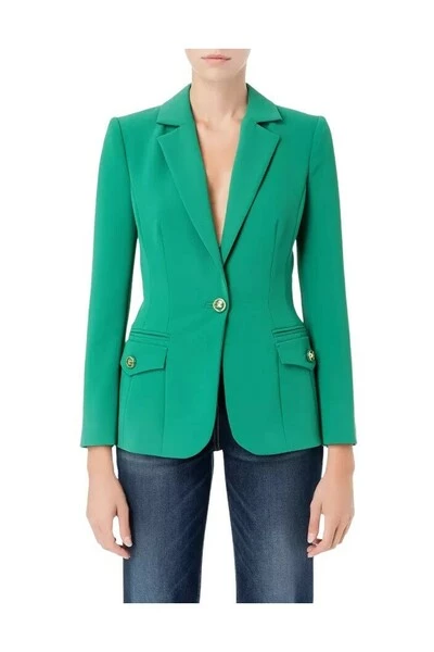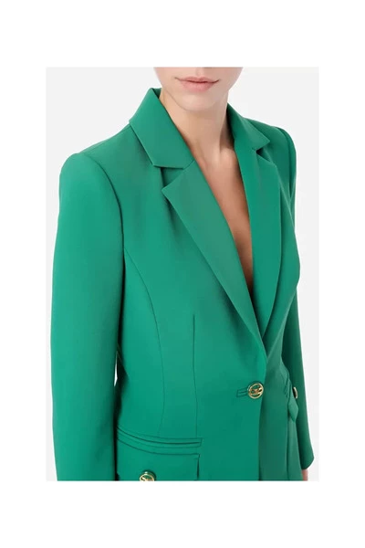 Stretch crêpe jas met slanke pasvorm en bevestiging met één knop, lange mouwen met bovenste leltzakken en onderste flap en knoopvakken. De knoppen bevinden zich in dezelfde kleur als de stof met gouden ring.