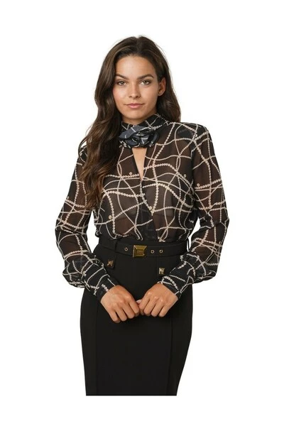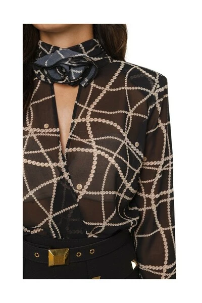 Blouse met print van het merk Elisabetta Franchi. De blouse heeft een v-hals en een knoopdetail. De mouwen hebben schoudervulling en knopen aan de onderkant. De blouse is een body model.