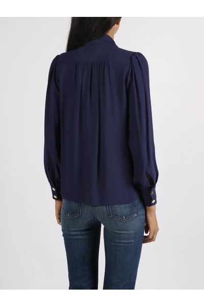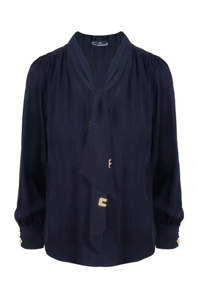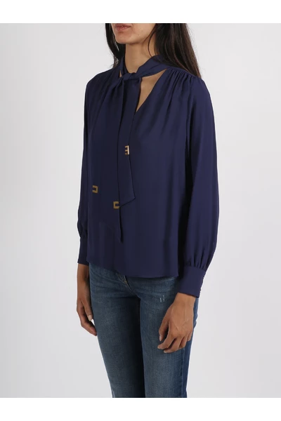 Elisabetta franchi viscose georgette blouse verfraaid met kleine gouden metalen clip logo plaques. – FW22 – Plunging V -neck – Geknoopte fout bij de nek – manchetten met knopen – Light Gold Logo Clip Plaque – gemaakt in Italië – 100%viscose