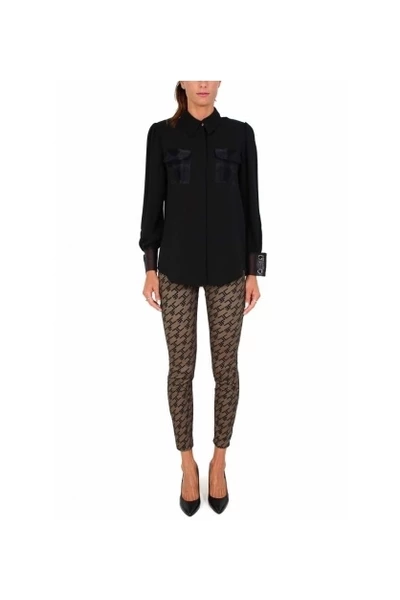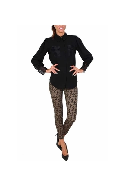 Vloeibare stof shirt van georgette met zakken aan de voorkant en manchetten in tule gedetailleerde knoopers bedekte schetsen zachtheid zwart zwarte kleur samenstelling 100% polyester kleding veren maat 42 modelhoogte 1,80 cm maat 40