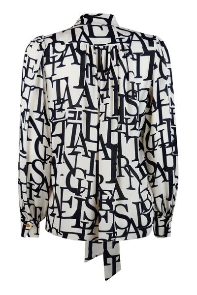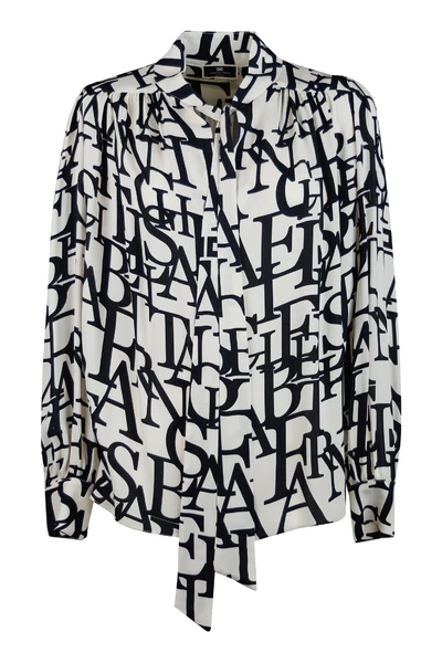 Elisabetta Franchi Blam Butter shirts in Georgette High Neck met Tie Sleeve Tie Squeezeal Pols Print Maxi Logo All-Over Samenstelling: 100% Viscose Kleur: Butter/Black Article Code: CA03926E2E8