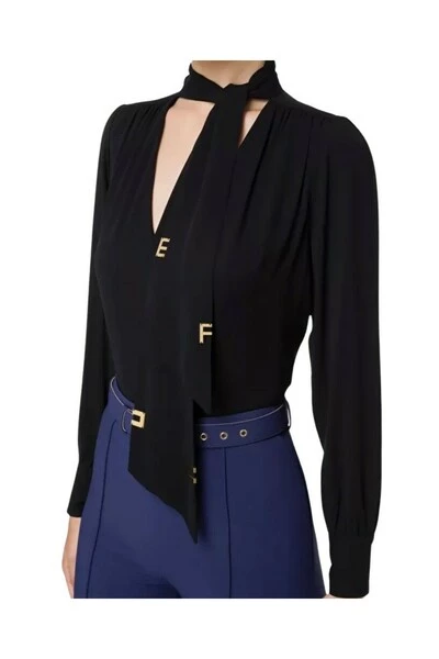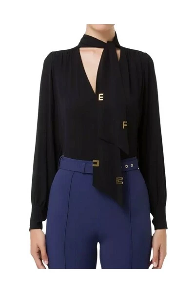 Viscose Georgette -shirt met een grote v -neck en sjaal geknoopt rond de nek verfraaid met kleine basislogo -platen, geplaatst langs de rand, in gouden metaal.