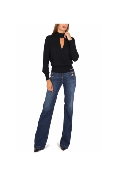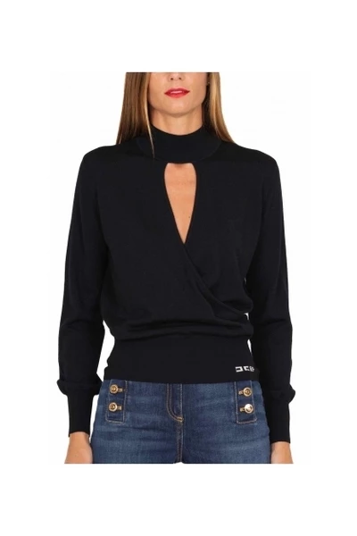 Hoge kraagtrui met kruising op de halslijn gedetailleerd logo ingelegd op het fonds gewone dressing zwarte kleurcompositie Samenstelling 100% wol maagdelijk kledingstuk gedragen maat 42 Modelhoogte 1,80 cm maat 40