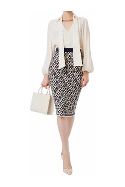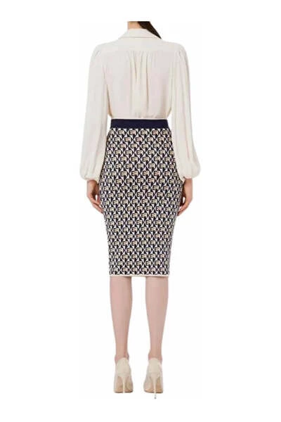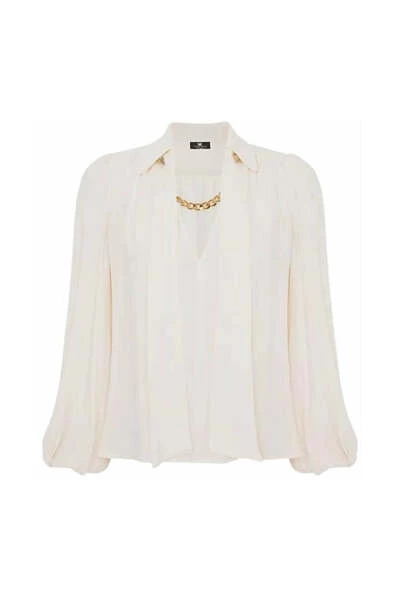 Viscose georgette shirt met grote mouwen ondertekend door Elisabetta -franchi, met een zachte lijn en een bepaalde reden voor sjaals met een dubbele ketting en maxi gouden metalen studs die de opening van de nek vooraan behouden. Details in dubbel georgette shirt grote mouwen zacht sjaalmotief met een dubbele ketting zachte jurk 100% viscose kabeljauw. CA00226E2