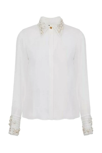 Zals: bemanning met collectomanica: Lange sluiting: Botttonidaal: rechte lijn, viscose georgette, nek en polsen met parel en kralen borduurwerk: wit -gemonteerd: 100% viscosaricamo: polystere, glas, glas, plastic, metallomad in: Italië in: Italië in: Italië