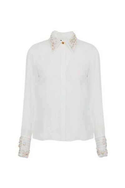 Langzaalshirt met een rechte lijn, in viscose georgette met nek en polsen verfraaid met een rijk borduurwerk van parels en kralen gemengd met elkaar.