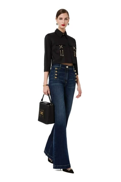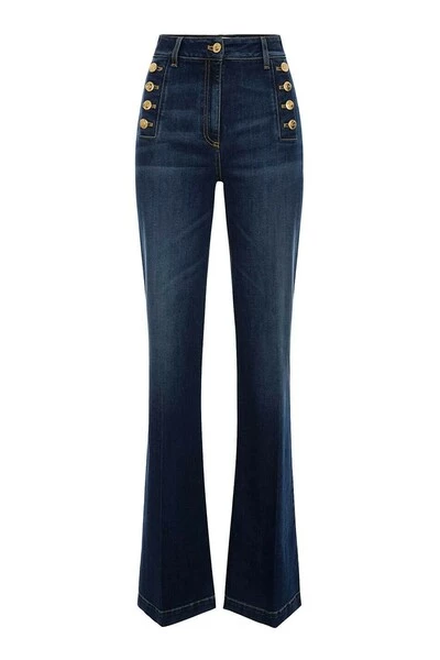 Elisabetta franchi jeans gemaakt van donkere washenim, verfraaid met een detail van gouden knoppen in de taille. Contrasterende stiksels, achterzakken met logo -details en zip- en knoopafsluiting. Breed been.