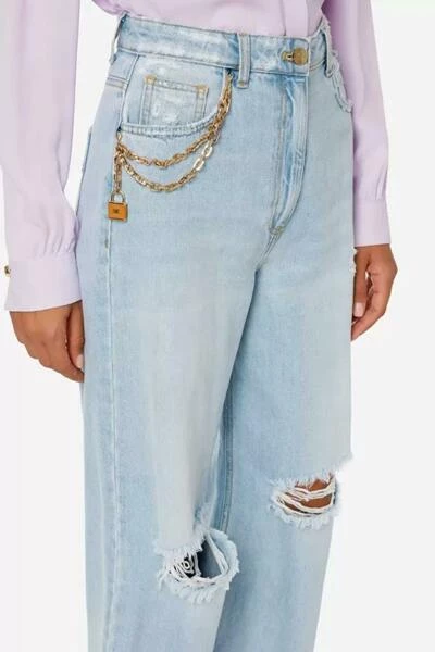 Elisabetta franchi jeans elisabetta franchi dames jeans, licht, wijde been, met tranen en rauwe snede, zip ; ; bevestiging en gouden logo gebroken knop, vijf-pocket model, gerafelde zoom, een zij licht goud accessoire, ketting met hangslot bedekt met eco-leer, Gemaakt in Italië.