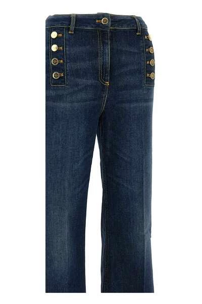 Jeans van Elisabetta Franchi. Dit model heeft een sluiting aan de voorkant met rits en knoop, zijknopen van goudkleurig metaal en twee zakken aan de achterkant, plaquette genaaid op achterzak, hoge taille. Gemaakt in Italië.