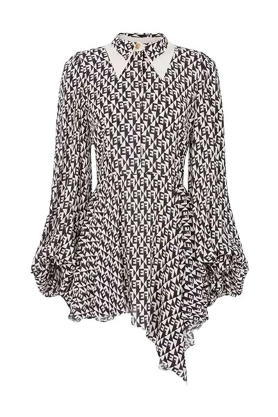 Korte jurk Elisabetta -franchi in Georgette met bedrukt zwart en boterdruk heeft een dubbele shirt kraag en drop -opening aan de voorkant. Lange mouwen met een groot volume eindigend in shirtpolsen. 100% viscose