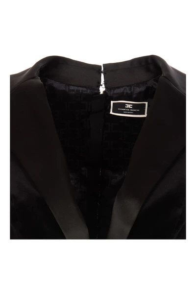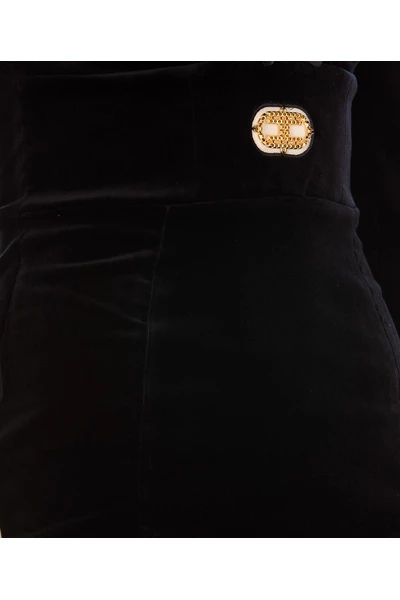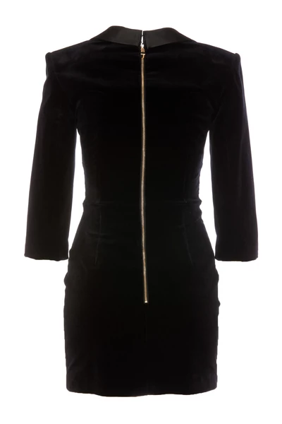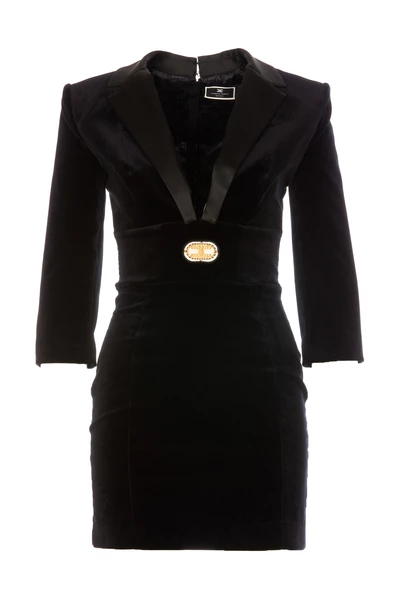 Zwarte fluwelen jurk voor vrouwen, ritssluiting op de rug, v-hals, verstevigde schouder, logo met plaquette op de voorkant, clic kraag.
