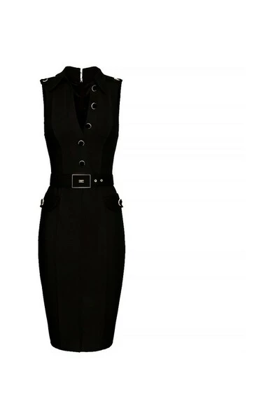 Damesjurk Elisabetta Franchi Zwarte kleur. Longuette. Versnipperd. V -neck met knoppen. Pijnen en monsters. Python -effectriem met het aanmelden van bucking