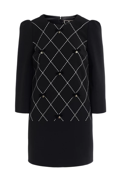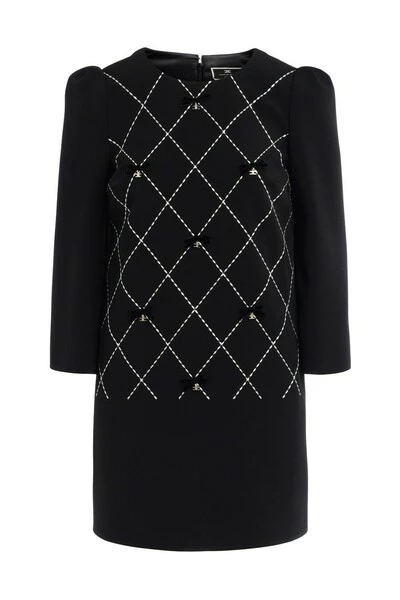 Zwarte jurk met ronde hals en wit borduursel. Strikjes met hanger met logo.