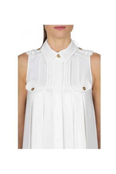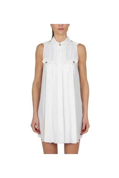 Korte en mouwloze jurk in geplooide vloeistofstof met shirt kraag details knoppen sluiting sluiting fit ivoor kleur samenstelling stof 100% polyester weared hoofd maat 40 Model hoogte 1,80 cm Maat 40
