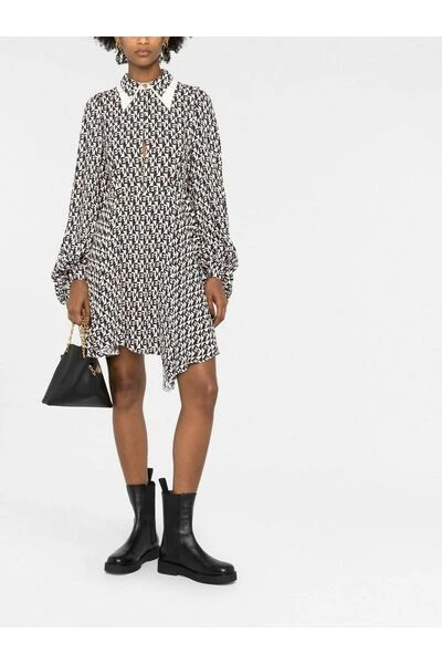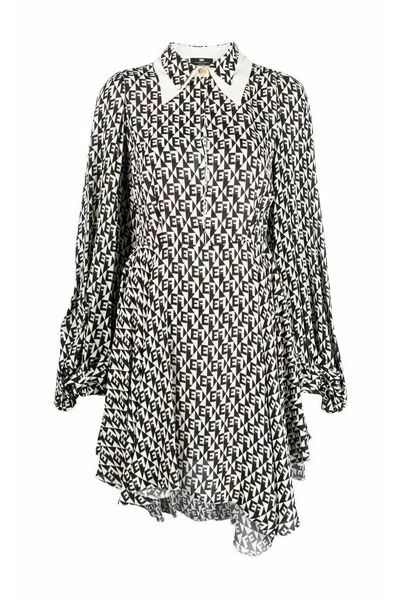 Elisabetta franchi-jurken logo-print asymmetrische mini-jurk van Elisabetta-franchi met zwart/wit, all-over logo-print, puntige platte kraag, lange puffmouwen, kortsluiting aan de voorkant en asymmetrische zoom.