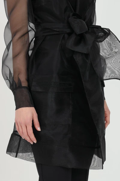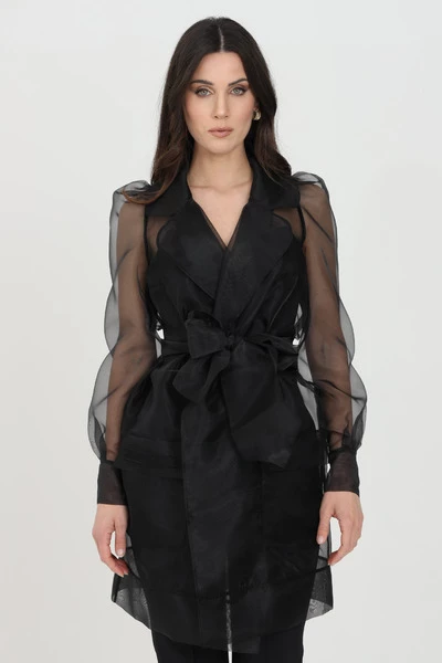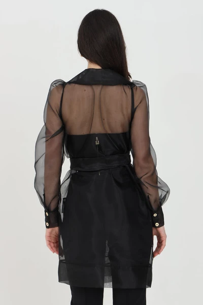 ELISABETTA FRANCHI Organza overhemd, trench-effect, met brede revers. Het kledingstuk wordt gesloten door een sjerp die het silhouet tekent. De mouwen zijn gekruld op de schouders en eindigen met een hemdpols die verlicht wordt door een gouden knoop. Een kostbaarhemd voor een geraffineerde en ultravrouwelijke look. 3/4 mouwen Ingelegd borduursel op de klep Revers Rechte pasvorm Model lengte en maat: 167cm | 40