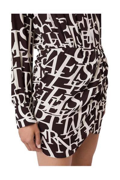 Elisabetta franchi -jurken zwarte korte jurk in viscose georgette zwart -witte letters print lange mouwen hoge manchetten gesloten door gouden logo -knoppen hoge kraag met strik gegolfde schouder korte wikkel rok met gordijnen samenstelling en details samenstelling: 100% viscose is niet gewassen gemaakt in Italië
