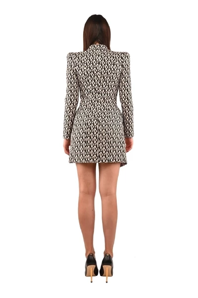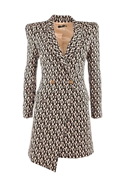 Korte jurk Elisabetta Franchi Tekening Rombi Print Monogram. Dubbele besmets model met twee ingelegde knoppen. Een elegante en verfijnde jurk om te dragen bij formele en speciale gelegenheden.