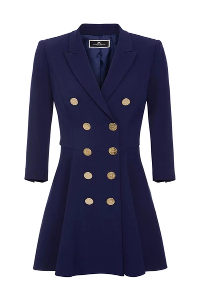 Elisabetta franchi blauwe jurken mini-jurk gewaad manteau in vloeibare crêpeblauw kleur zachte wijd uitlopende rok aan de onderste dubbele breasted knopen met logoed licht gouden knopen 3/4 mouwen interne voeringsamenstelling en details samenstelling: 91% polyester, 9% elastaan hand wassen gemaakt in Italië
