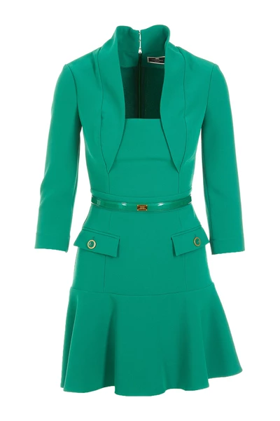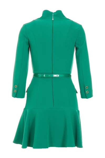 Elisabetta -franchi -jurken groene mini -jurk, achterste ritssluiting, knopen op manchetten, achterhaak sluiting detaiuls, riemdetail