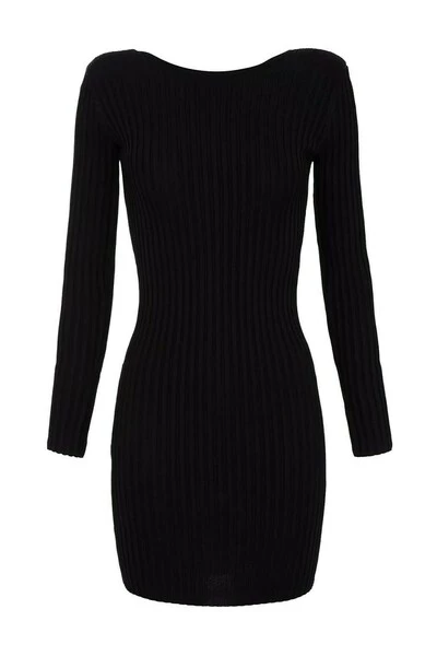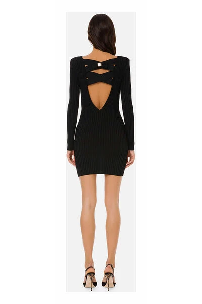 Elisabetta Franchi jurk gemaakt van geribbelde viscosemix in zwarte tinten, met lange mouwen en brede rughalslijn met gekruiste banden detail en strik met gouden metalen logo. Gewatteerde schouder, slanke pasvorm. Materiaal: 78% viscose, 22% poliamid Productstijl-ID: AM99G22E2-110 Deze beschrijving is automatisch vertaald.