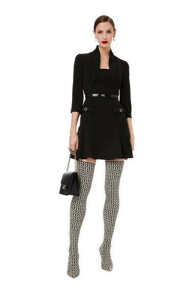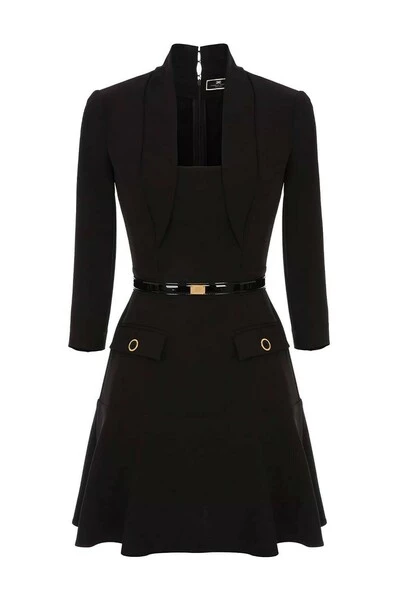 Elisabetta Franchi jurk van zwarte synthetische stof, met een top met bolero-effect en 3/4-mouwen, uitlopende rok met riem met logo in de taille. Patte met knopen aan de voorkant, ritssluiting aan de achterkant.