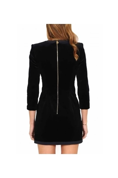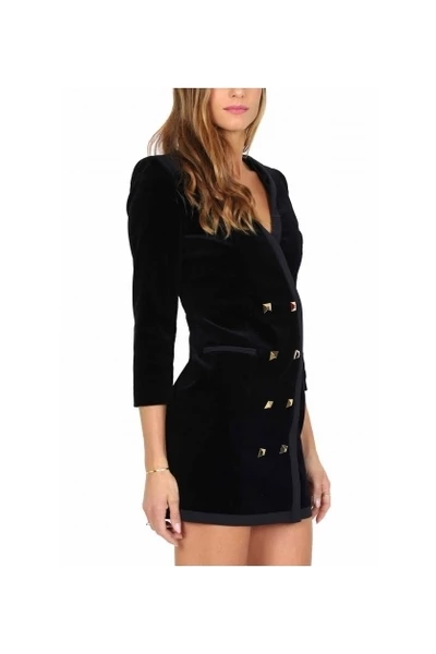 Robe manteau -jurk met dubbele borde fluwelen fluwelen stretch met crêpe randen en piramidale logo -vormige knoppen details met ritssluiting op de achterste fitting zwarte kleur samenstelling