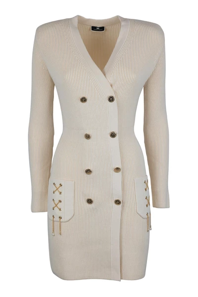 Elisabetta franchi -jurken boterjurk in shirt met v -sketch dubbele -beklaagde staven gouden knopen loggates aangebrachte zakken detail van gekruiste ketens Samenstelling: 66% viscose, 29% polyester, 5% polyamide