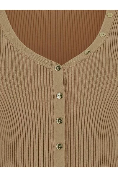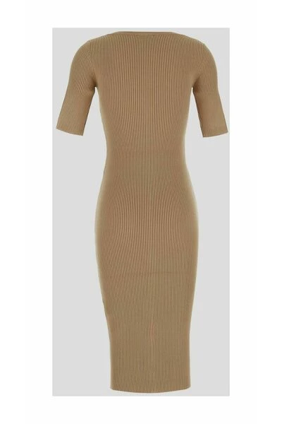 Elisabetta franchi MIDI -jurk in cappuccino gekleurde viscose met geribbelde textuur en voorste sluiting met knoppen.