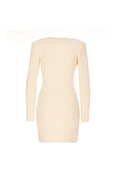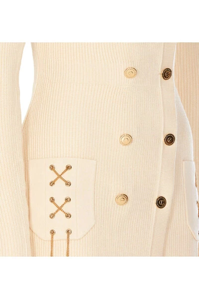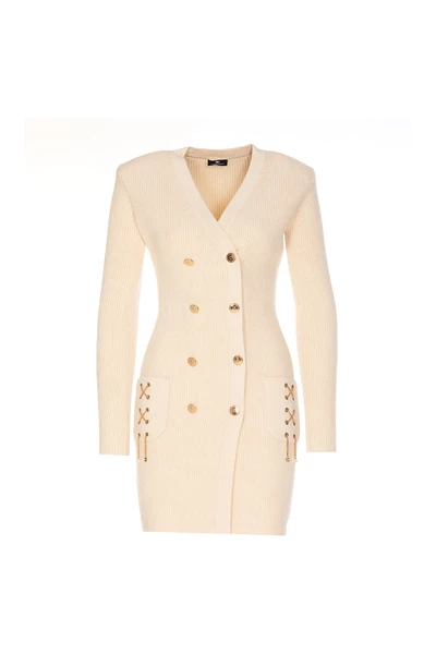 Elisabetta franchi jurken beige vrouw jurk, knoopsluiting, brei, logo gouden knoppen, frontale zakken, kettingadvertenties pareldetails, renforced schouders
