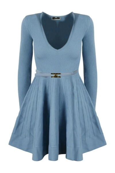 Elisabetta -franchi geribbelde midi -jurk, met afneembare dubbele C diamant logo gesp riem. – FW22 – V -nek – Gesneden aan de taille – afneembare riem met dubbele C -diamanteffect gesp – gemaakt in Italië – 49%viscose 30%polyestere 21%polyamide